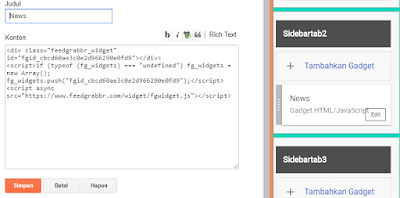 2. mulai lah berkereasi membuat tampilan yang nantinya kita gunakan di blog kita copy kan link atau alamat rss dari website berita yang kita inginkan.